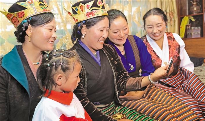 墨竹工卡縣群眾通過手機收看慶祝大會。記者 洛桑 次旺 唐斌 潘多 攝
