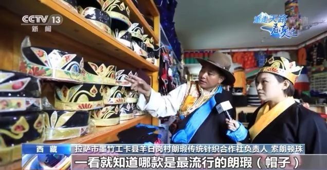 拉薩市墨竹工卡縣羊日崗村朗瑕傳統針織合作社負責人 索朗頓珠:我們這的姑娘小伙兒,一看就知道哪款是最流行的朗瑕(帽子),這是個去年款,這個是今年的款。你看,這兩個是牦牛角。朗瑕(帽子)很有我們藏族特色,同時也在與時俱進,看這些做工、花紋越來越精致了。