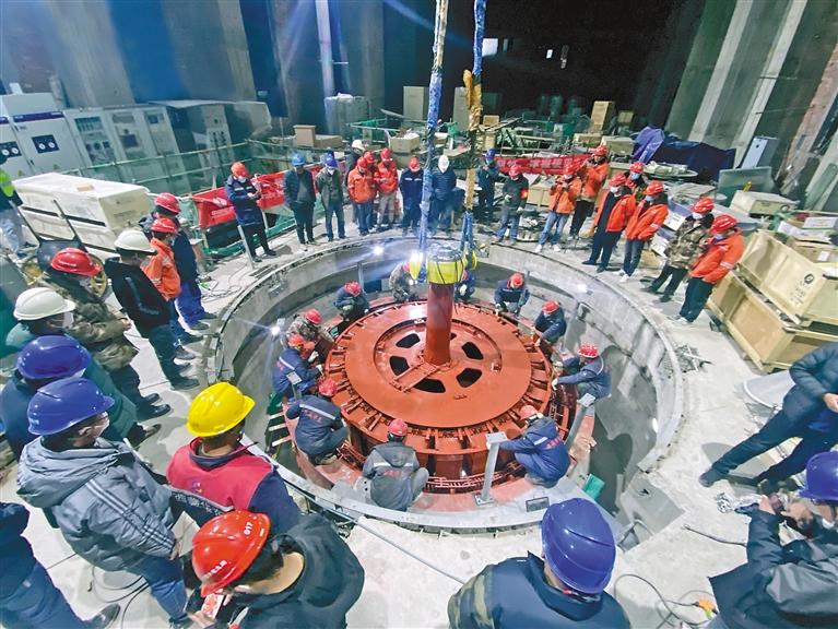 西藏湘河水利樞紐首臺機組轉子吊裝成功