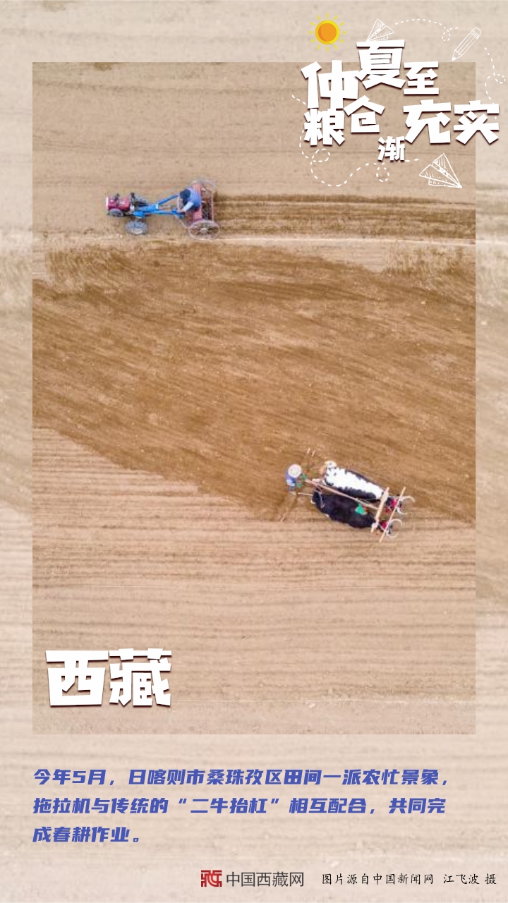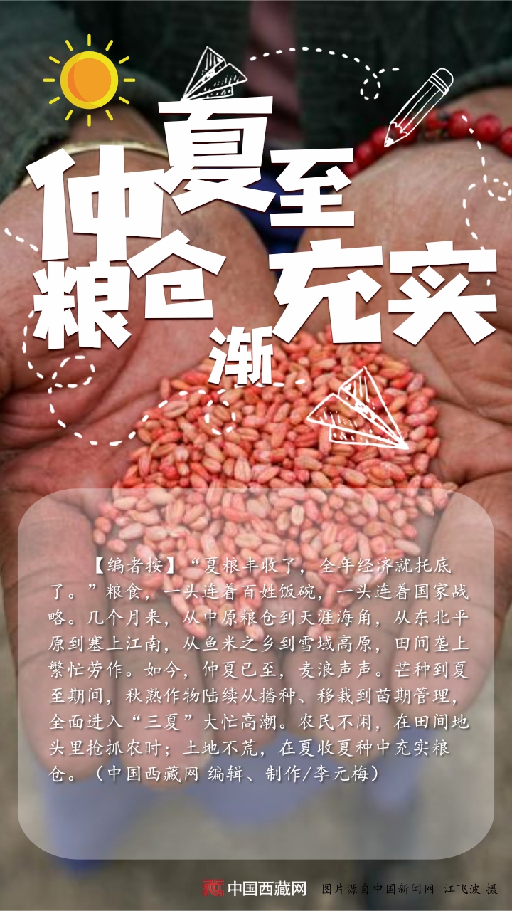 【編者按】“夏糧豐收了,全年經(jīng)濟(jì)就托底了?!奔Z食,一頭連著百姓飯碗,一頭連著國(guó)家戰(zhàn)略。幾個(gè)月來(lái),從中原糧倉(cāng)到天涯海角,從東北平原到塞上江南,從魚(yú)米之鄉(xiāng)到雪域高原,田間壟上繁忙勞作。如今,仲夏已至,麥浪聲聲。芒種到夏至期間,秋熟作物陸續(xù)從播種、移栽到苗期管理,全面進(jìn)入“三夏”大忙高潮。農(nóng)民不閑,在田間地頭里搶抓農(nóng)時(shí);土地不荒,在夏收夏種中充實(shí)糧倉(cāng)。(中國(guó)西藏網(wǎng) 編輯、制作/李元梅)