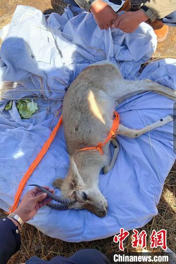 圖為達日縣森林公安局民警協(xié)同達日縣農(nóng)牧局獸醫(yī)站工作人員一同對受傷藏原羚進行救助。達日縣森林公安局供圖