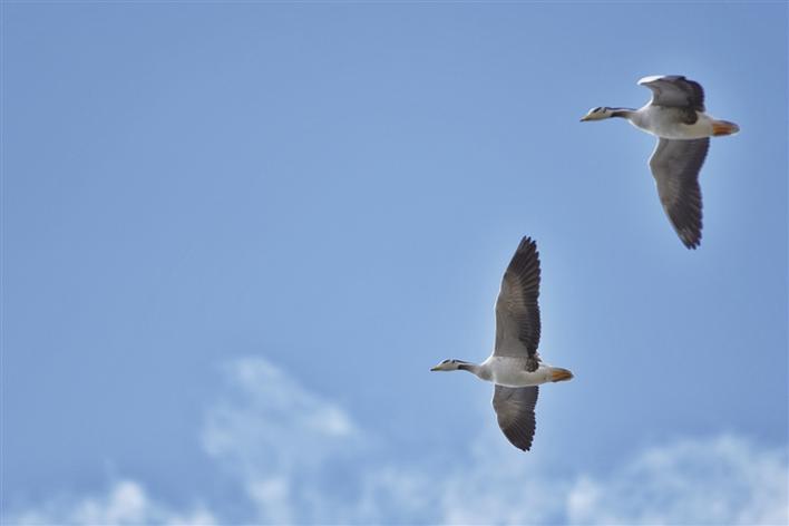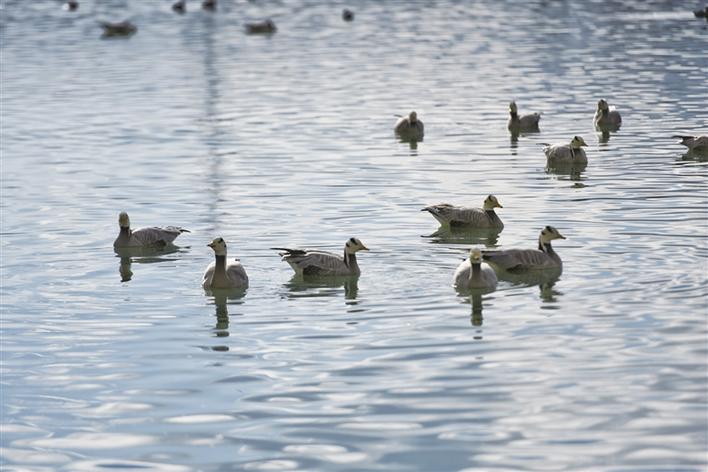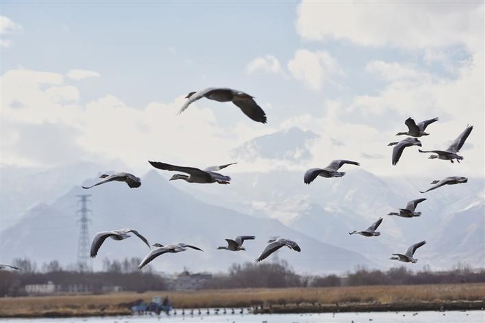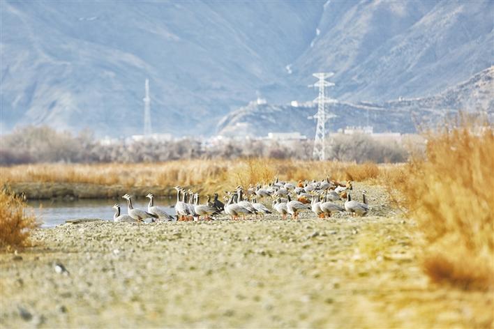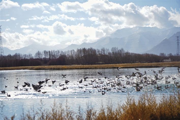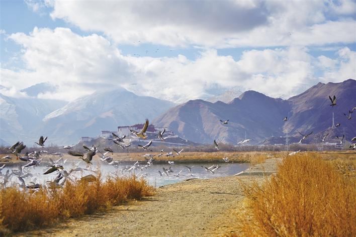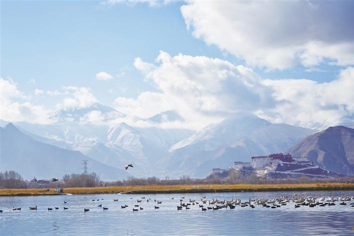 遠處,連綿起伏的山頂還覆蓋著薄薄的積雪,布達拉宮雄偉而秀美;近處,濕地內隨意顯現(xiàn)出的一塊塊水泊,成群的候鳥在水中玩耍嬉戲、在藍天白云下飛舞。見到可愛的飼養(yǎng)員帶來它們喜歡的麥粒,斑頭雁、紅隼、赤麻鴨、黃鴨等紛紛游上岸來,盡情地享受美食,發(fā)出歡快的叫聲。