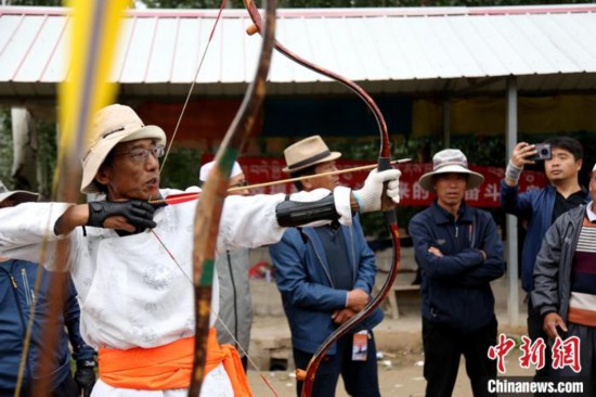 圖為8月14日,民間選手參加2020年青海尖扎 德吉“五彩神箭”射箭賽。 中新社記者 張?zhí)砀?攝