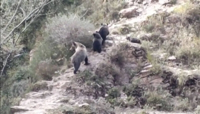黑豹野生動物保護站站長李理介紹:“我們傍晚5點左右架設好設備, 6點30分左右就拍到藏棕熊了,當時非常興奮”。他說:“當時天馬上就黑了,山里忽然下起了冰渣子,藏棕熊就在樹林間若隱若現(xiàn),后來它跑到一個光禿禿的山下,它狀態(tài)很好,非常健壯?!焙芸?,大家又發(fā)現(xiàn)了第二只。隊員們的衣服都被冰渣子打濕了,高山上非常冷,但還是給相機做好防水,拍下了這寶貴的畫面。第二天傍晚,還是在同一地點,前一天晚上觀測到的一只藏棕熊再次出現(xiàn),不過這次,它帶了兩只小熊。大公熊強壯而霸道,帶幼崽的母熊小心謹慎,小熊憨態(tài)可掬,都非??蓯?。