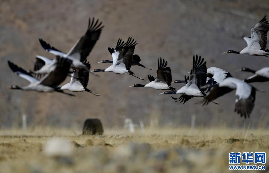 黑頸鶴在自然保護(hù)區(qū)里飛翔(2021年1月3日攝)。新華社記者 張汝鋒 攝