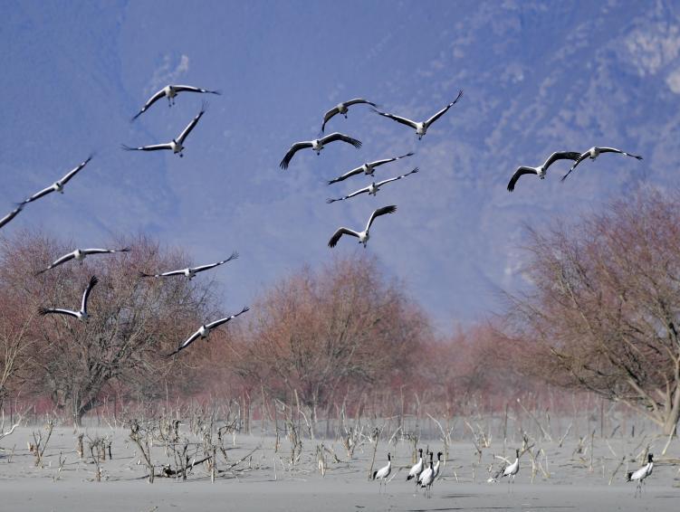 冬季,成群結隊的黑頸鶴遷徙到西藏林芝市,雅魯藏布江及江畔的農(nóng)田成了它們越冬的樂園。[詳細] -