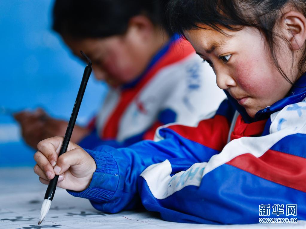 在玉樹藏族自治州紅旗小學,學生在上書法課(3月19日攝)。新華社記者 張龍 攝