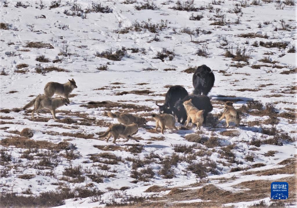 這是在四川省阿壩藏族羌族自治州若爾蓋縣境內(nèi)拍攝的草原狼圍攻牦牛(2019年12月18日攝)。新華社 王冀川 攝