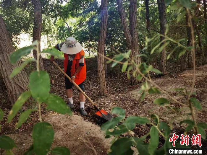 圖為金昌市區(qū)環(huán)城防護林的護林員巡查樹木。 史靜靜 攝