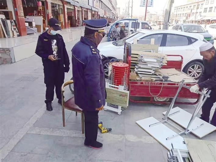 執(zhí)法人員對(duì)占道經(jīng)營商戶進(jìn)行勸說。圖由城關(guān)區(qū)城管局提供
