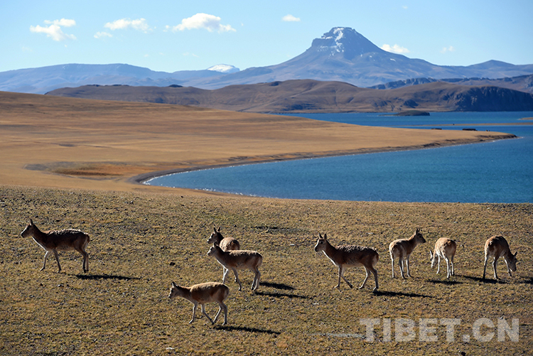 湖濱河畔,地勢平坦開闊,水草豐盛甜美,是藏羚羊頻繁活動的場所。藏羚羊是一種善跑的動物,跑起來輕快灑脫、疾如長風,時速可達80公里。