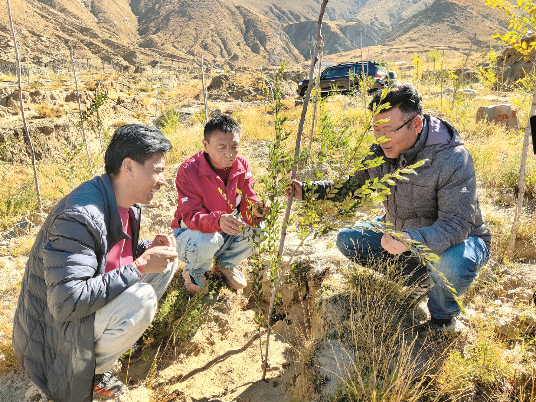圖為工作人員在協(xié)榮村營(yíng)造林“先造后補(bǔ)”作業(yè)點(diǎn)上查看苗禾生長(zhǎng)情況。 拉薩融媒記者 余洋洋攝