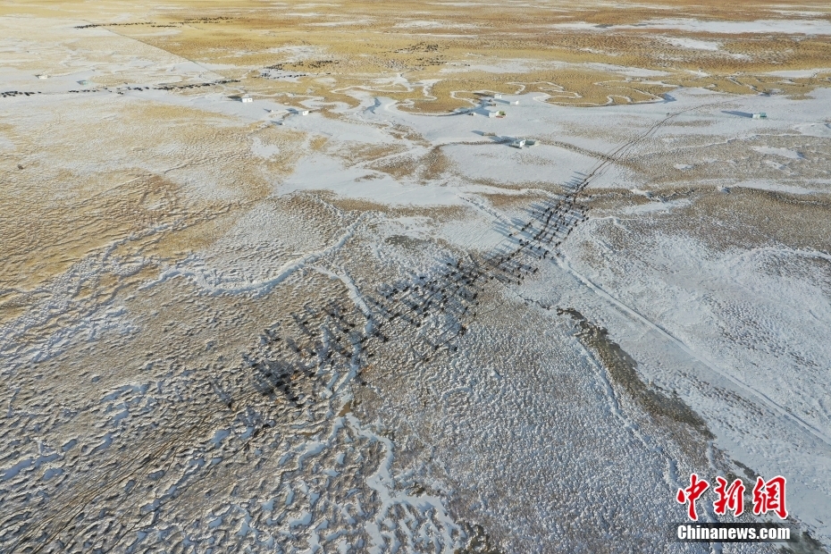 1月27日,當(dāng)雄縣龍仁鄉(xiāng)烏達(dá)村牧民在雪中放牧。當(dāng)雄縣位于西藏自治區(qū)拉薩市北部,距拉薩市區(qū)170公里?!爱?dāng)雄”,藏語意為“天選牧場”,平均海拔約4200米,草場廣闊,土地肥沃。(無人機(jī)照片) 中新社記者 貢嘎來松 攝