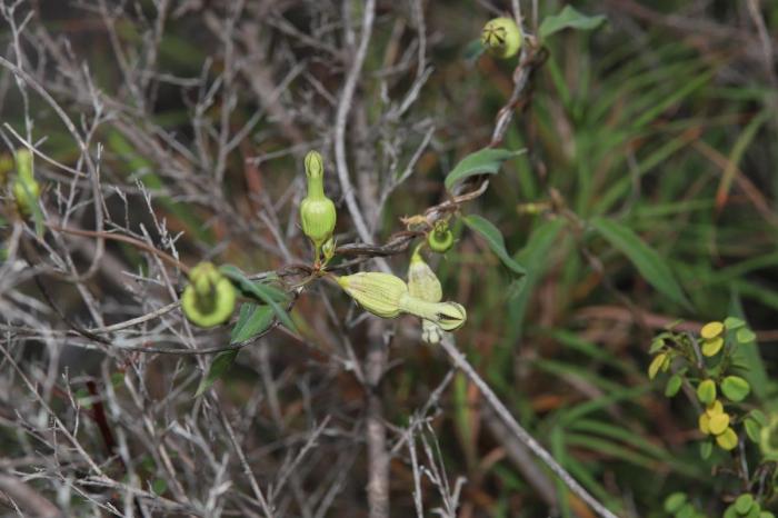 綠汁江吊燈花形態(tài)上與匙冠吊燈花近似,但該種花梗較長(zhǎng)且疏被柔毛,花冠筒上部的直徑僅為下部的一半,花冠裂片內(nèi)部密被白色長(zhǎng)柔毛,外輪副花冠裂片具2齒,這些特征可與其近似種明顯區(qū)別。目前,科研人員僅在易門縣綠汁鎮(zhèn)后山坡發(fā)現(xiàn)一個(gè)居群,零星的分布在干熱河谷稀樹灌草叢中,生境受人為干擾較為嚴(yán)重,根據(jù)IUCN的評(píng)估標(biāo)準(zhǔn)將其瀕危等級(jí)評(píng)估為極危。