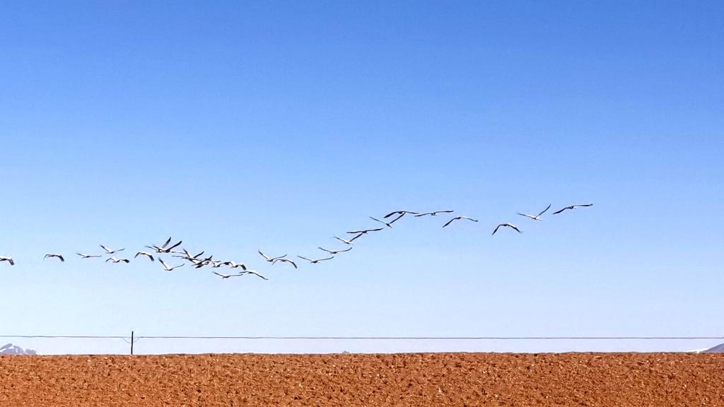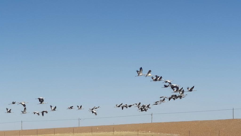 蓑羽鶴生性機(jī)警,記者所乘車輛在約百米遠(yuǎn)處剛停下,成群的蓑羽鶴便展翅高飛,發(fā)出陣陣?guó)Q叫,急急地向東北方向飛去。