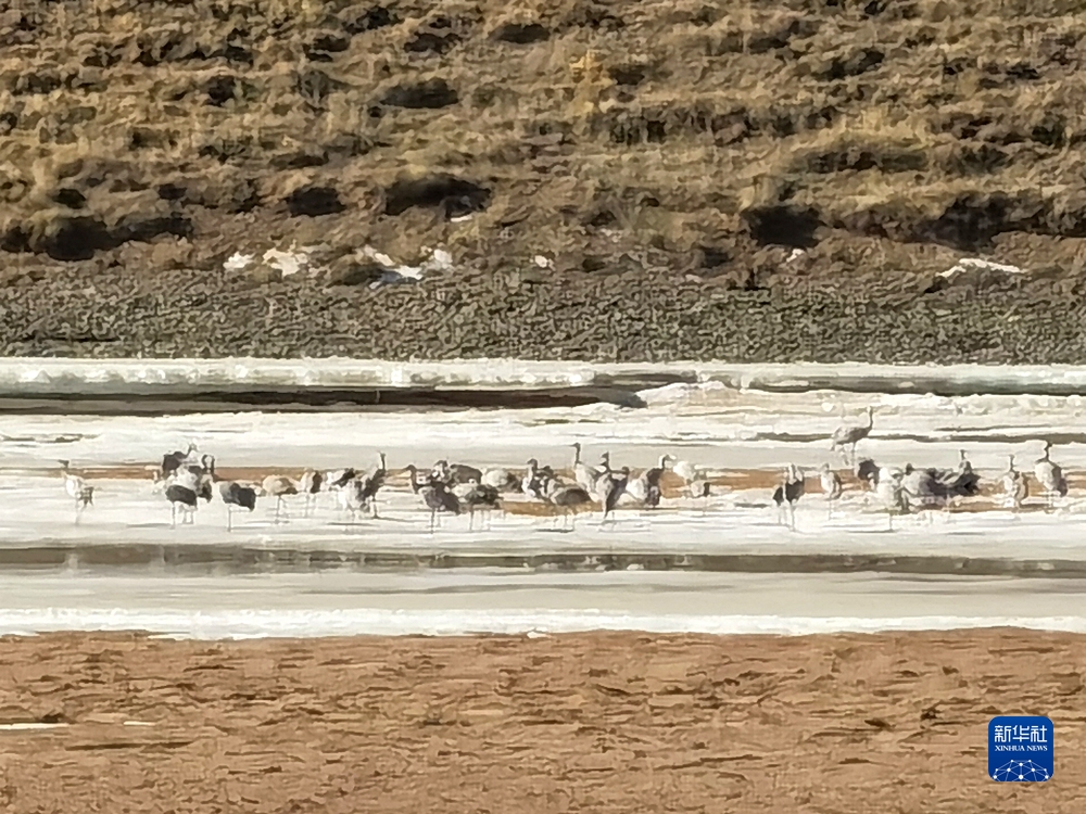3月13日,在位于瑪多縣境內的三江源國家公園黃河源園區(qū),記者拍攝到的一群蓑羽鶴在黃河干流河道間棲息覓食。新華社記者 呂雪莉 攝