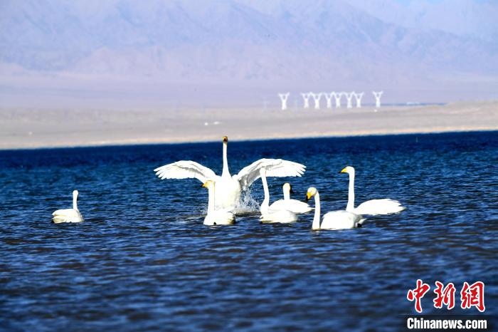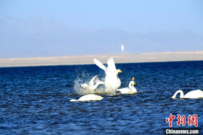 圖為天鵝群在湖中戲水?!〈饔婪?攝