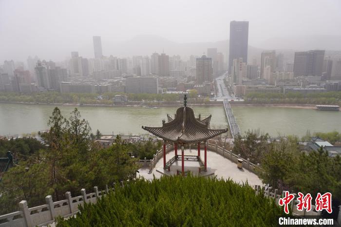 圖為3月24日,從蘭州市白塔山上,眺望被沙塵籠罩的黃河對岸城區(qū)?!【琶赖┰?攝