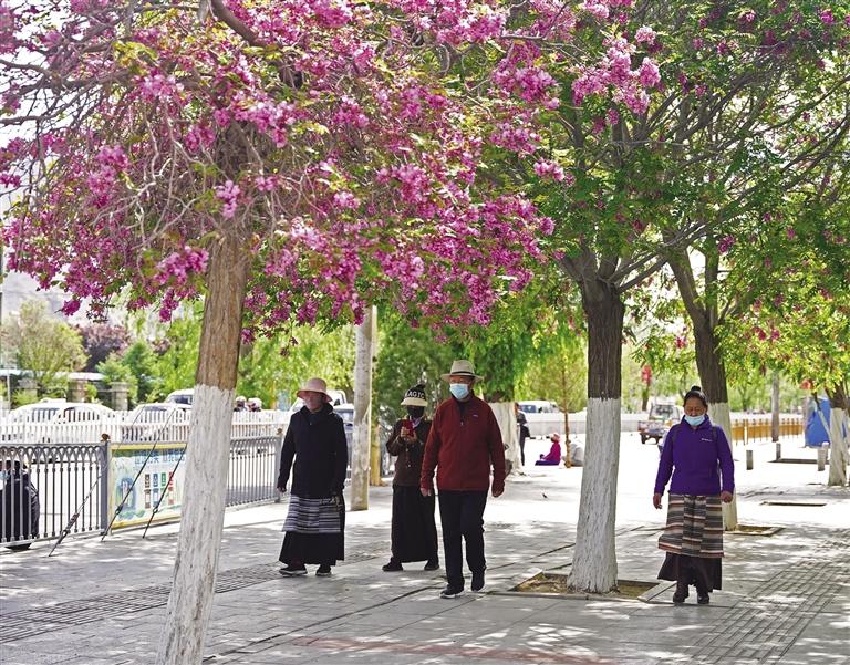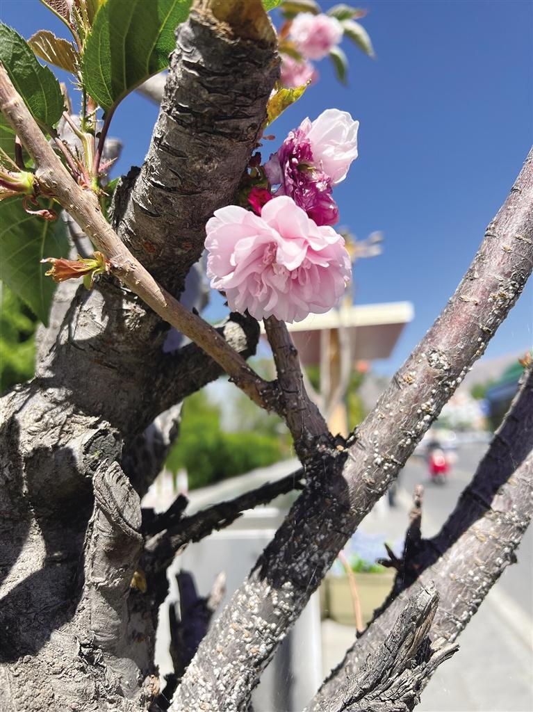 如今,走在市區(qū)街頭或公園,隨處可以看到開花的樹種,有的已經(jīng)凋零,有的開得正艷,有的含苞待放。在布達拉宮腳下的北京中路道路兩側(cè)櫻花全面盛開,粉紅色的櫻花宛如云霞,花瓣隨著微風簌簌落下,煞是浪漫。將初夏的北京中路裝扮成一幅美麗的畫卷,吸引許多市民和游客賞花拍照。