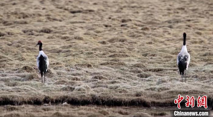 圖為兩只黑頸鶴在濕地中漫步。 天峻縣融媒體中心 供圖