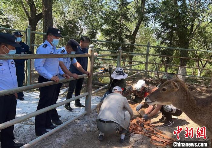 圖為青海省野生動物救助中心工作人員對白唇鹿進(jìn)行檢查。 尖扎縣公安局供圖