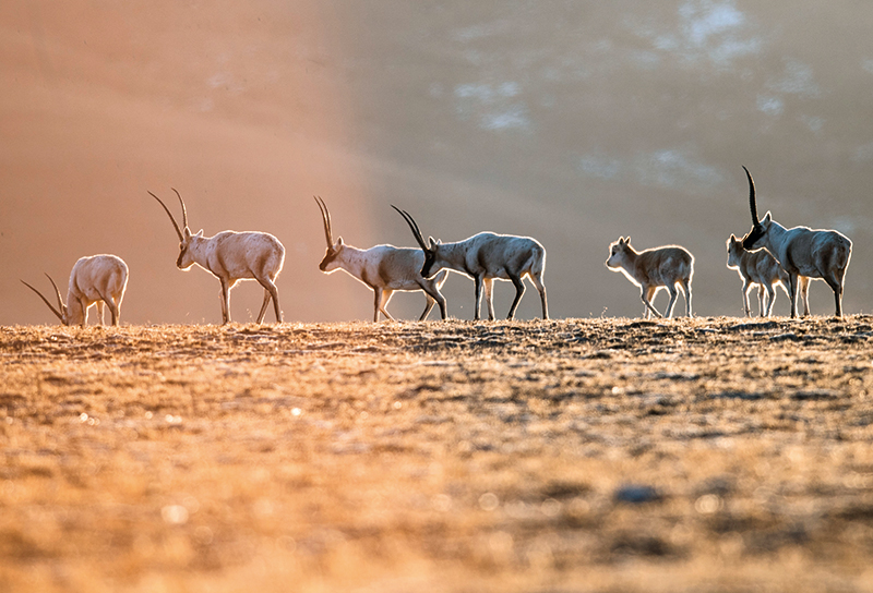 4月的傍晚,金色的霞光灑落在綿延的草原上。遠(yuǎn)處成群的藏羚羊、藏野驢時而低頭進食,時而邁步奔跑。