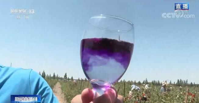 除了紅枸杞之外,這里還種植了15000多畝的有機(jī)黑枸杞,黑枸杞的成熟時(shí)間要遲一些,在8月下旬,所以我現(xiàn)在手里只有黑枸杞干。大家可以看一看,如果我們把它也像紅枸杞一樣泡入水中的話,顏色展開得非常快,幾秒鐘的時(shí)間水就已經(jīng)是藍(lán)紫色了。當(dāng)?shù)氐呢?fù)責(zé)人告訴我,這很大程度是因?yàn)樗幕ㄇ嗨睾扛撸院阼坭揭灿辛硗庖粋€(gè)名字,叫作“花青素之王”。