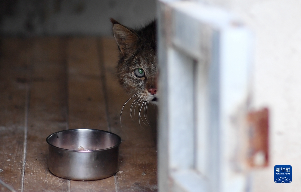 9月18日,受救護(hù)的荒漠貓?jiān)谇嗪R吧鷦游锞茸o(hù)繁育中心進(jìn)食。新華社記者 張宏祥 攝