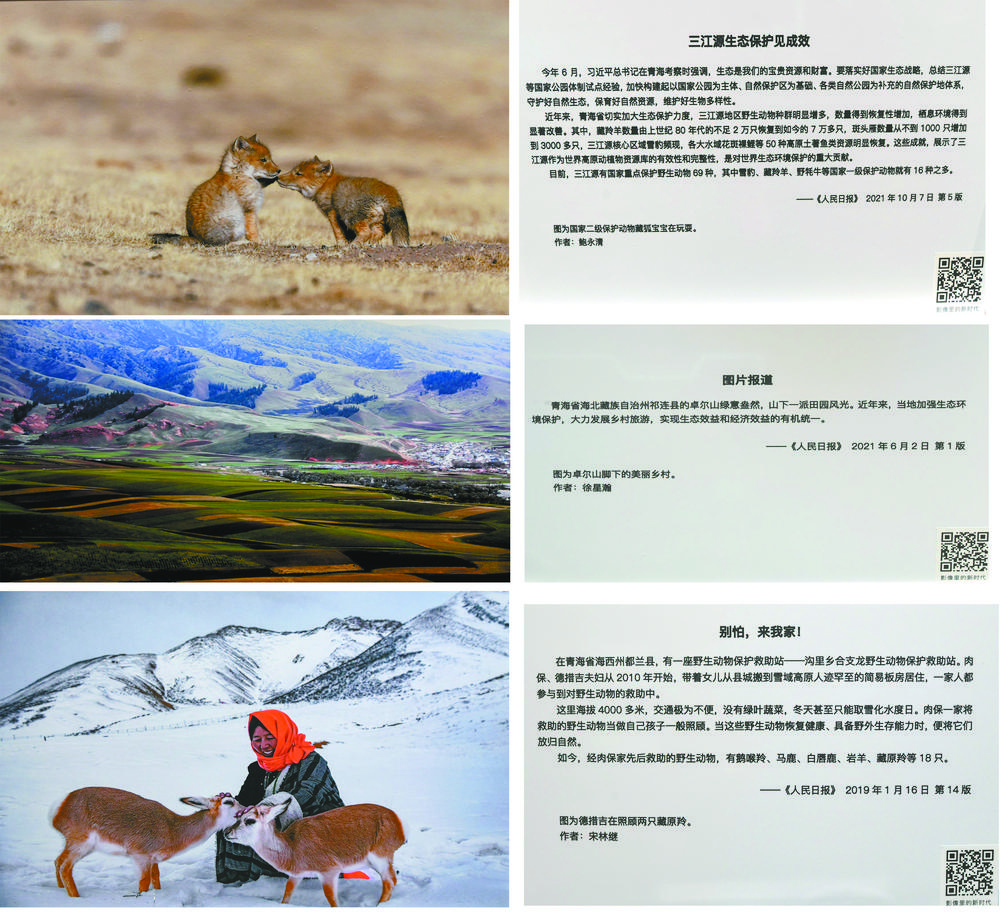 兩只憨態(tài)可掬的藏狐寶寶、卓爾山腳下的美麗鄉(xiāng)村、人與自然和諧共生的美好畫面……黨的二十大新聞中心融媒體體驗區(qū)互動展示墻上三張反映青海生態(tài)的照片,吸引了境內外媒體記者的關注。 本報記者 祁國彪 魏慧敏 攝
