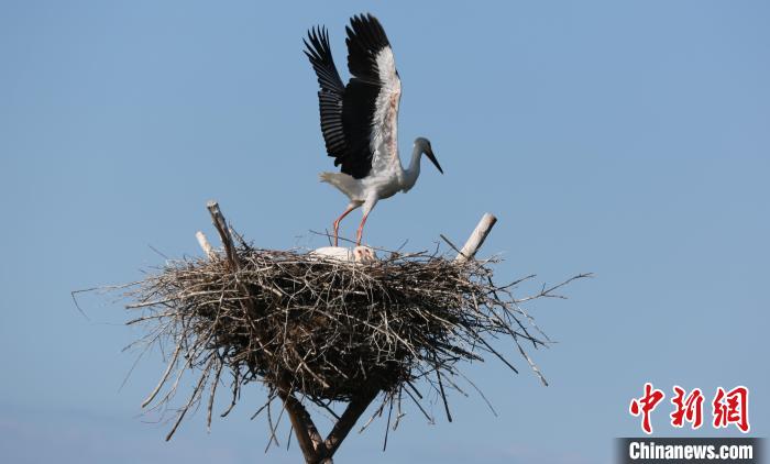 在人工巢內(nèi)的東方白鸛?!『邶埥楹訃壹?jí)自然保護(hù)區(qū)管理局提供