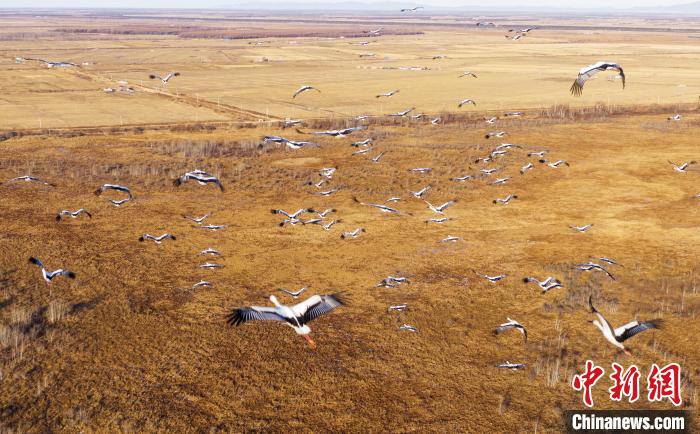 秋季集群的東方白鸛群?!『邶埥楹訃壹?jí)自然保護(hù)區(qū)管理局提供