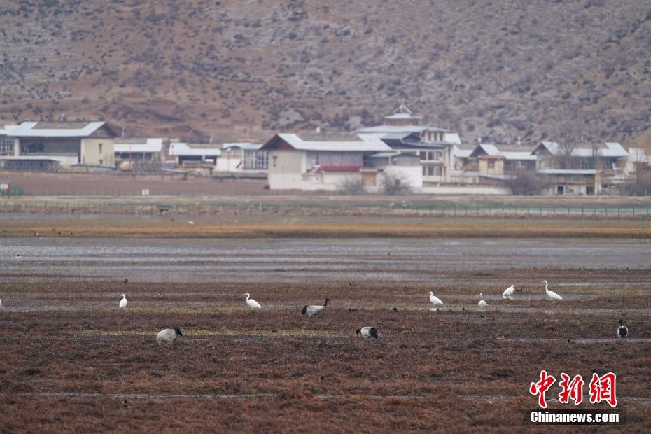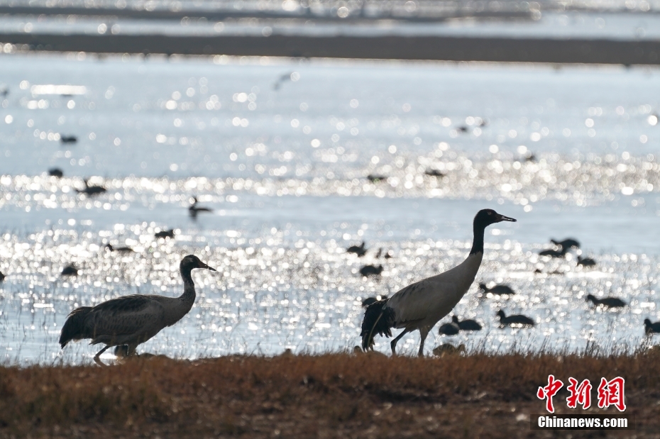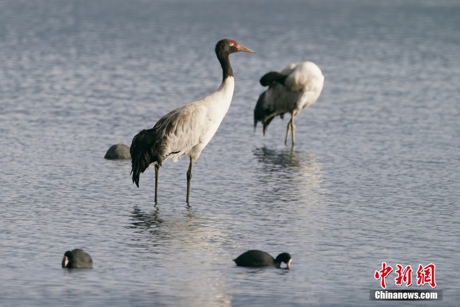 2月21日,黑頸鶴在納帕海岸邊覓食。中新社記者 劉冉陽(yáng) 攝