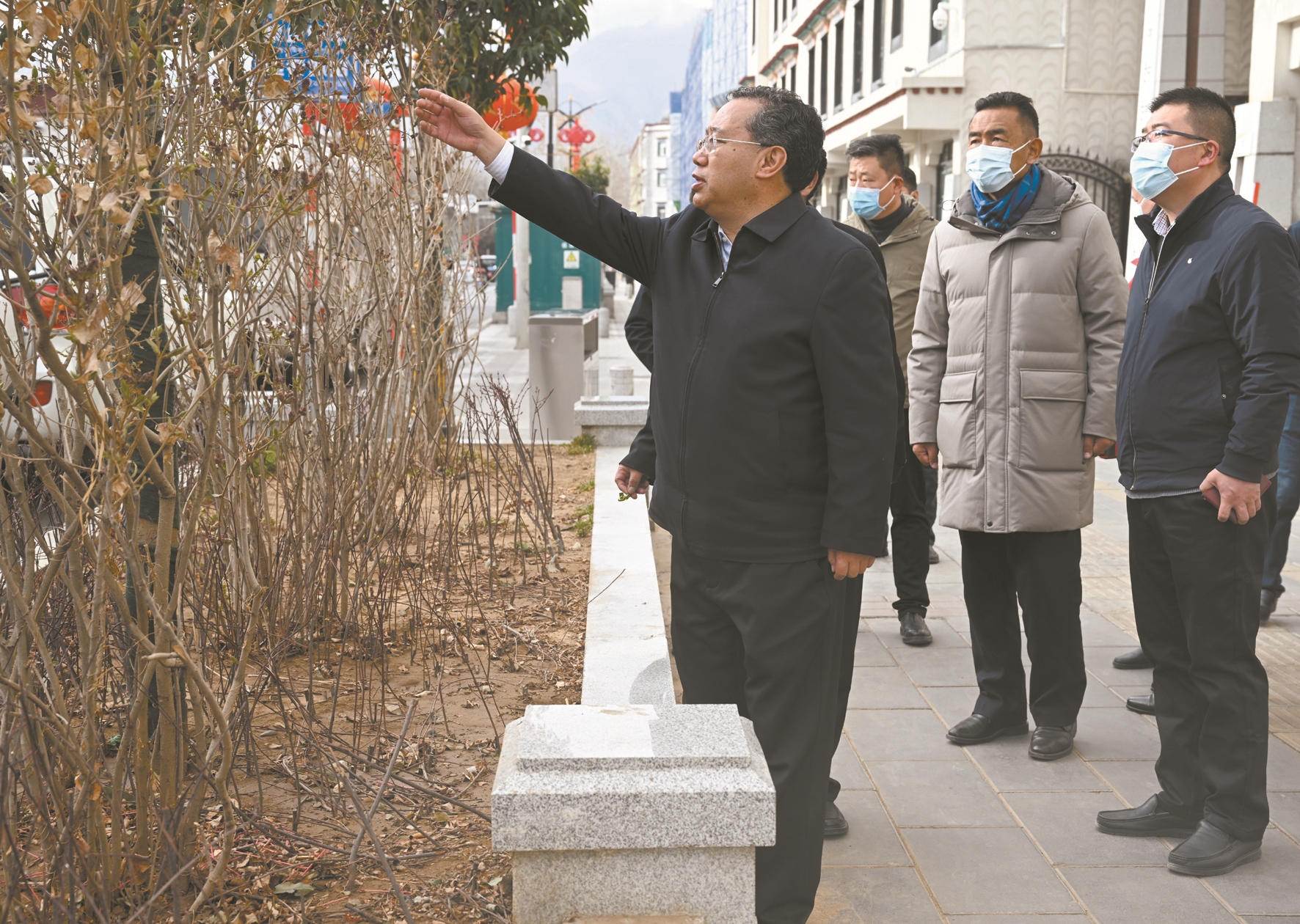 3月15日,西藏自治區(qū)黨委常委、市委書記普布頓珠帶隊(duì)深入城關(guān)區(qū),調(diào)研城市建設(shè)管理工作。圖為普布頓珠在朵森格路中段調(diào)研道路兩旁綠化帶植物缺損問(wèn)題。拉薩融媒記者 巴桑次仁攝