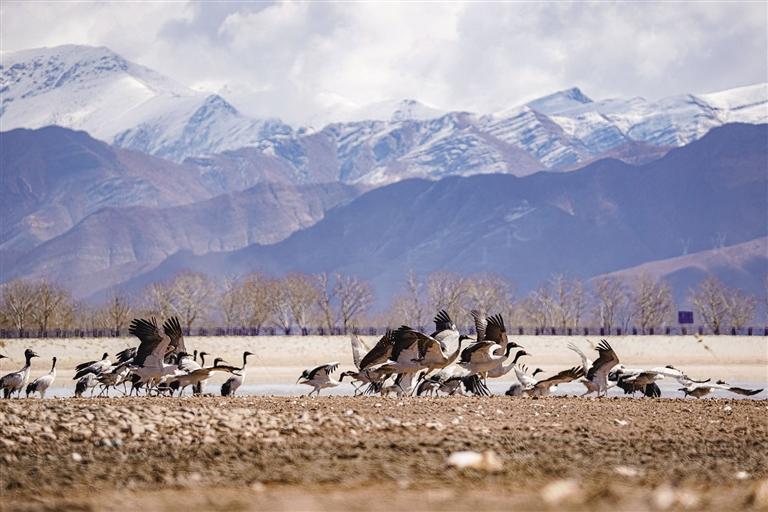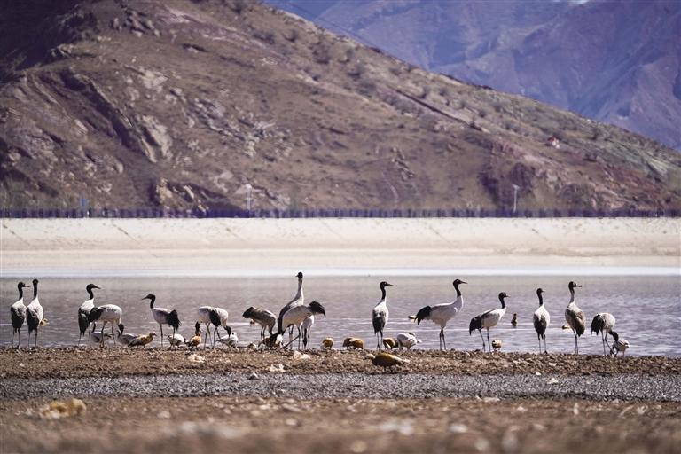黑頸鶴是國(guó)家一級(jí)保護(hù)動(dòng)物,在藏語(yǔ)中稱為“沖沖”。主要棲息在海拔2500米至5000米的高原、草甸、沼澤地帶。拉薩北部的林周縣平均海拔約4200米,是黑頸鶴的主要越冬地之一。最近這段時(shí)間,對(duì)拉薩市林周縣野保員們來(lái)說(shuō),一邊要忙自家的農(nóng)活,一邊還要巡查候鳥情況。“已經(jīng)有一小部分飛走了,估計(jì)再過半個(gè)月都會(huì)陸續(xù)飛走?!?月23日上午,野保員旦增告訴記者,在虎頭山水庫(kù)和卡孜水庫(kù)越冬的候鳥有一部分已經(jīng)飛走了。野保員口中的“飛走”便是遷徙,遷徙是候鳥的本能,一年一年,跟隨時(shí)間的召喚,完成兩次遷徙:繁殖和越冬。