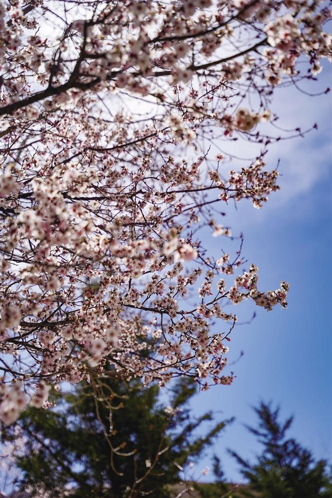 4月的帕邦喀,桃花開得正茂,桃樹枝上早已經(jīng)掛滿了大大小小的花朵,沿著石板臺階走走停停,可以看到桃樹舒展枝條,朵朵桃花爬上枝頭沐浴著春日的暖陽,在藍天白云、紅墻金頂?shù)挠骋r之下格外美麗,構(gòu)成一幅絕妙的春景詩畫。偶爾枝頭傳來清脆的鳥鳴聲,讓這里顯得愈發(fā)靜謐美好。