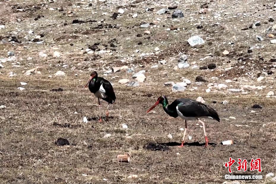 近日,攝影師在位于祁連山國家公園青海片區(qū)的青海省海北藏族自治州祁連縣阿柔鄉(xiāng)境內拍攝到兩只黑鸛愜意覓食、翱翔。