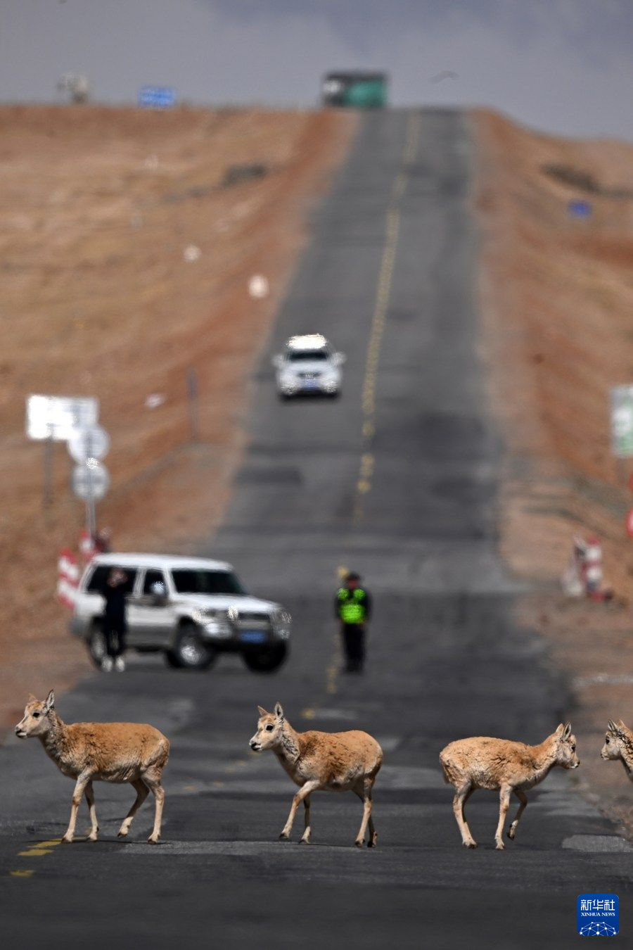 5月28日,在青??煽晌骼铮蝗捍菩源a(chǎn)藏羚羊通過青藏公路。新華社記者 張宏祥 攝