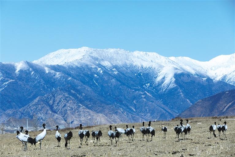 國家一級(jí)保護(hù)動(dòng)物黑頸鶴在墨竹工卡縣境內(nèi)的農(nóng)田里覓食。