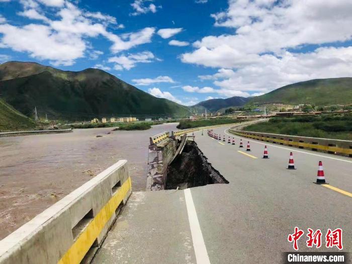 圖為2020年6月15日,青海果洛班瑪縣暴雨災害造成道路被沖毀。青海省氣候中心供圖