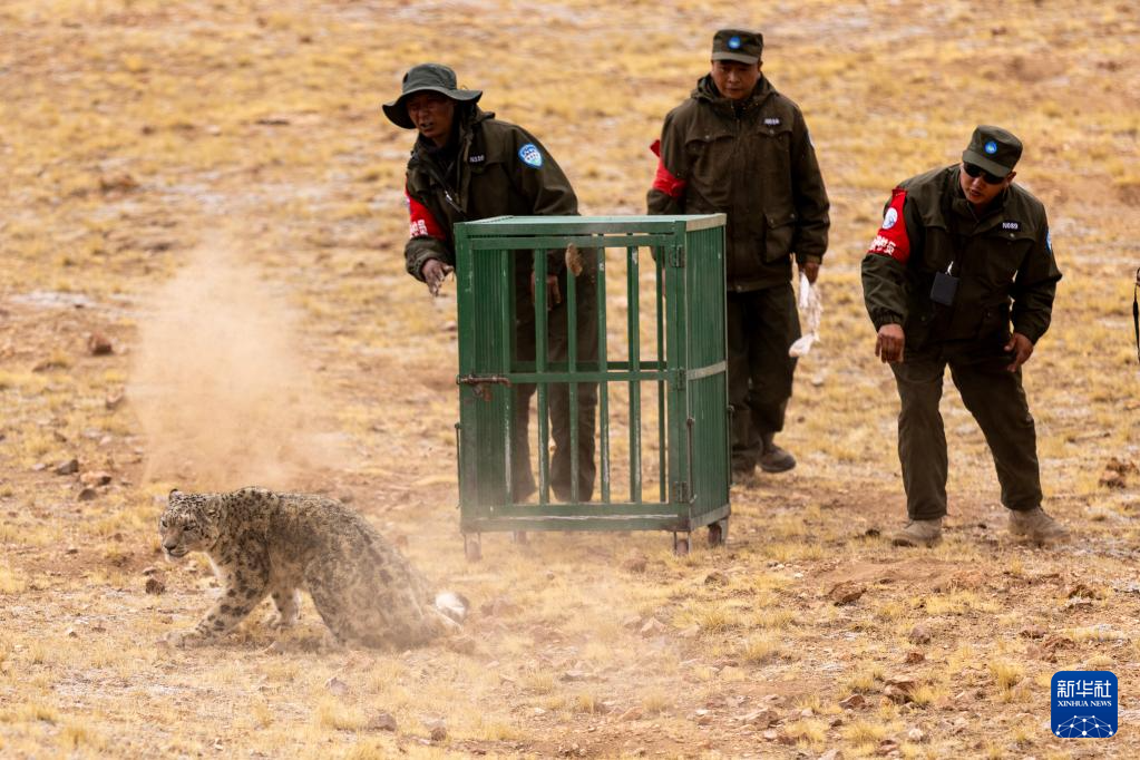 5月7日,尼瑪縣野生動物管護隊工作人員在羌塘國家級自然保護區(qū)核心區(qū)將雪豹放歸自然。新華社記者 姜帆 攝??
