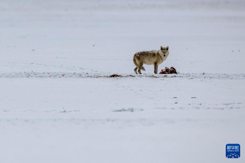 在西藏那曲市尼瑪縣境內(nèi)的羌塘國家級自然保護(hù)區(qū)核心區(qū),一只狼在進(jìn)食(5月9日攝)。新華社記者 姜帆 攝
