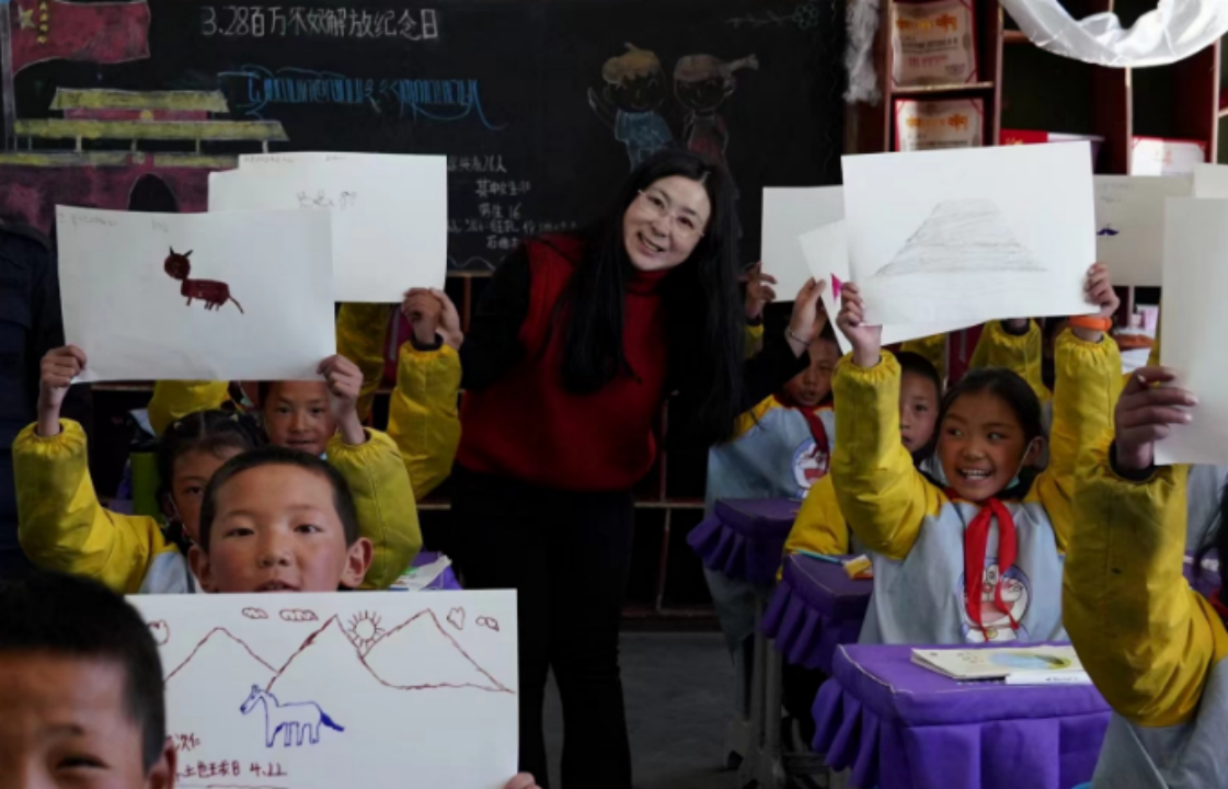 圖為“喜馬拉雅生靈的朋友”自然影像聯(lián)盟聯(lián)合創(chuàng)始人張麗娜為那曲市申扎縣第二完全小學(xué)學(xué)生講授自然教育知識。