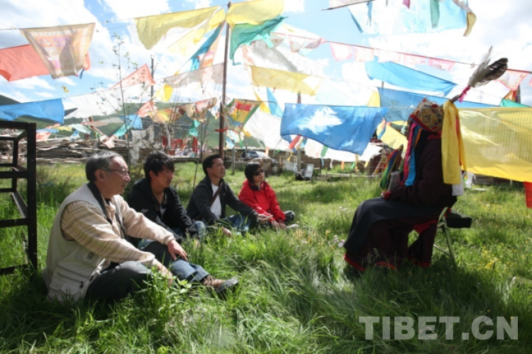 圖為2010年7月,說唱藝人俄珍卓瑪在家中庭院里為我們說唱她從石頭里看到的史詩《格薩爾》。楊嘉銘先生為前一,紅衣者為作者,旁左為色達縣文化旅游局副局長四朗彭措。