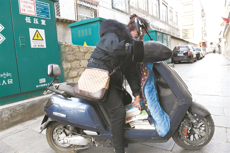 圖為城關(guān)區(qū)第二小學(xué)三年級(11)班班主任旦增色珍騎著電動車把分類分揀好的教材送到學(xué)生家中。