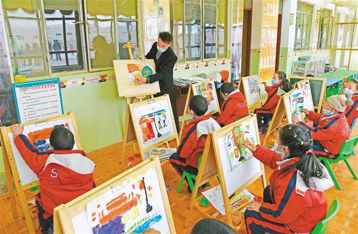 圖為買巴鄉(xiāng)小學學生正在課堂上以繪畫的方式表達對偉大祖國的熱愛之情。記者 唐斌 次旺 攝