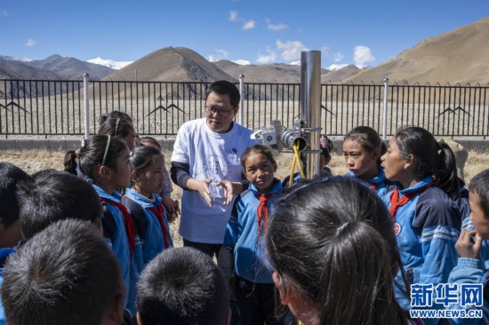 5月23日,工作人員為參加“公眾科學日”活動的學生介紹珠峰站內的科研設備。新華社記者 普布扎西 攝
