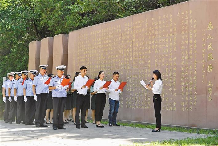 6月29日,在延安市張思德廣場,黨員干部在誦讀《為人民服務》。新華社記者 張博文 攝