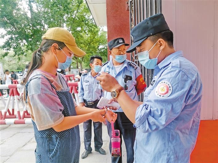 圖為在拉薩中學考點門口,工作人員對即將進入考點熟悉環(huán)境的考生進行體溫檢測和身份驗證。記者 王莉 攝