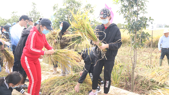 在雜交水稻實驗田,同學們穿著膠鞋,戴著手套,手持鐮刀,雙手緊握稻稈賣力地打谷,全然不顧額頭上的汗水。還有同學穿梭在田間,將割下的新稻搬到打谷場,將打完的稻稈抱到馬路邊。