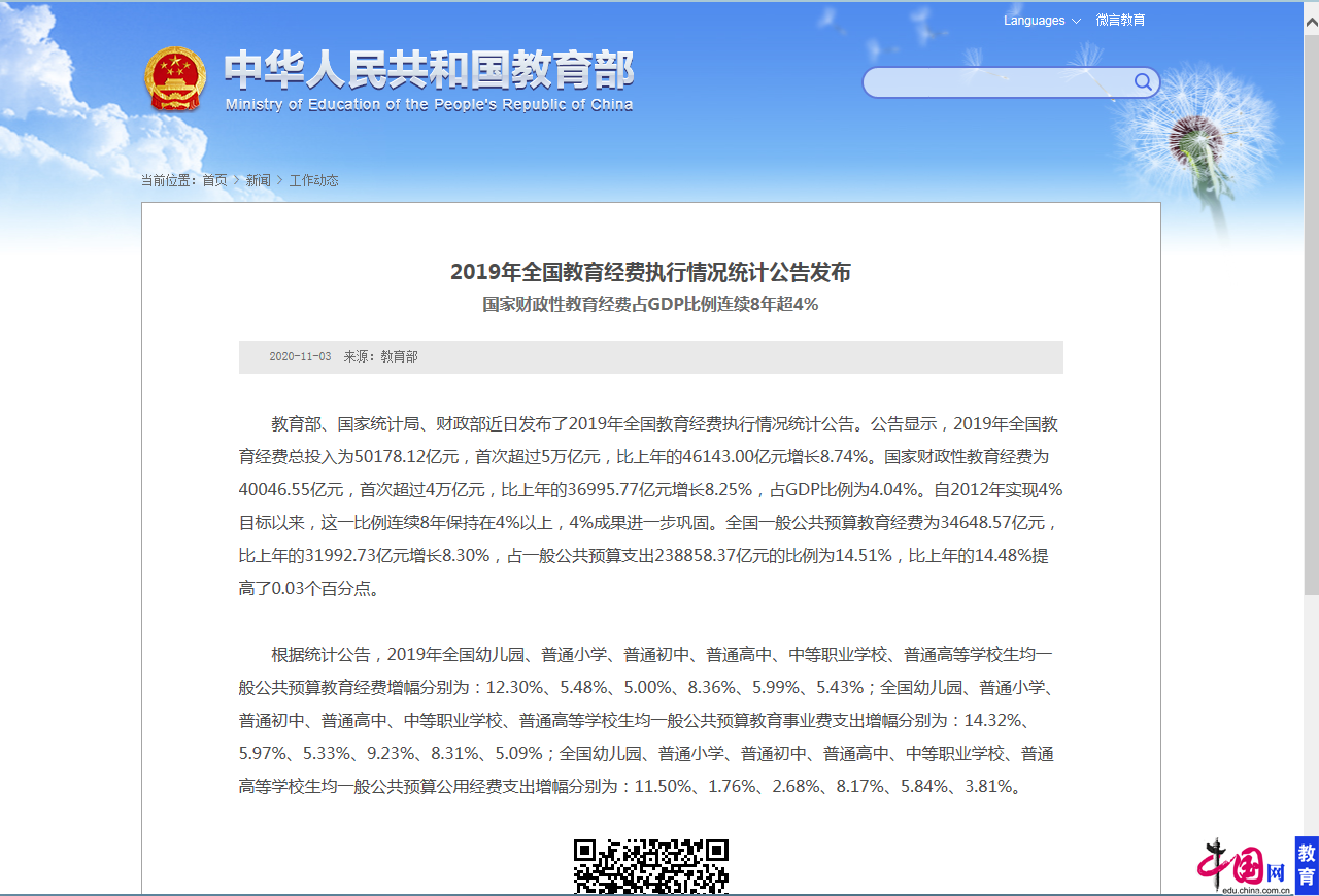 在教育部、國家統(tǒng)計局、財政部公布的《統(tǒng)計公告》中,中國網記者注意到,2019年全國教育經費總投入為50178.12億元,首次超過5萬億元,比上年的46143.00億元增長8.74%。
